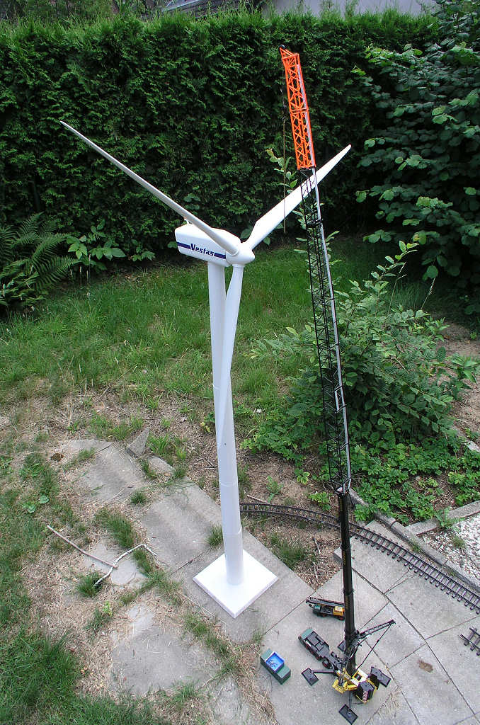Teleskopmast auf 50 m ausgeschoben, der Kran soll die Flügel an der Windkraftanlage auswechseln.