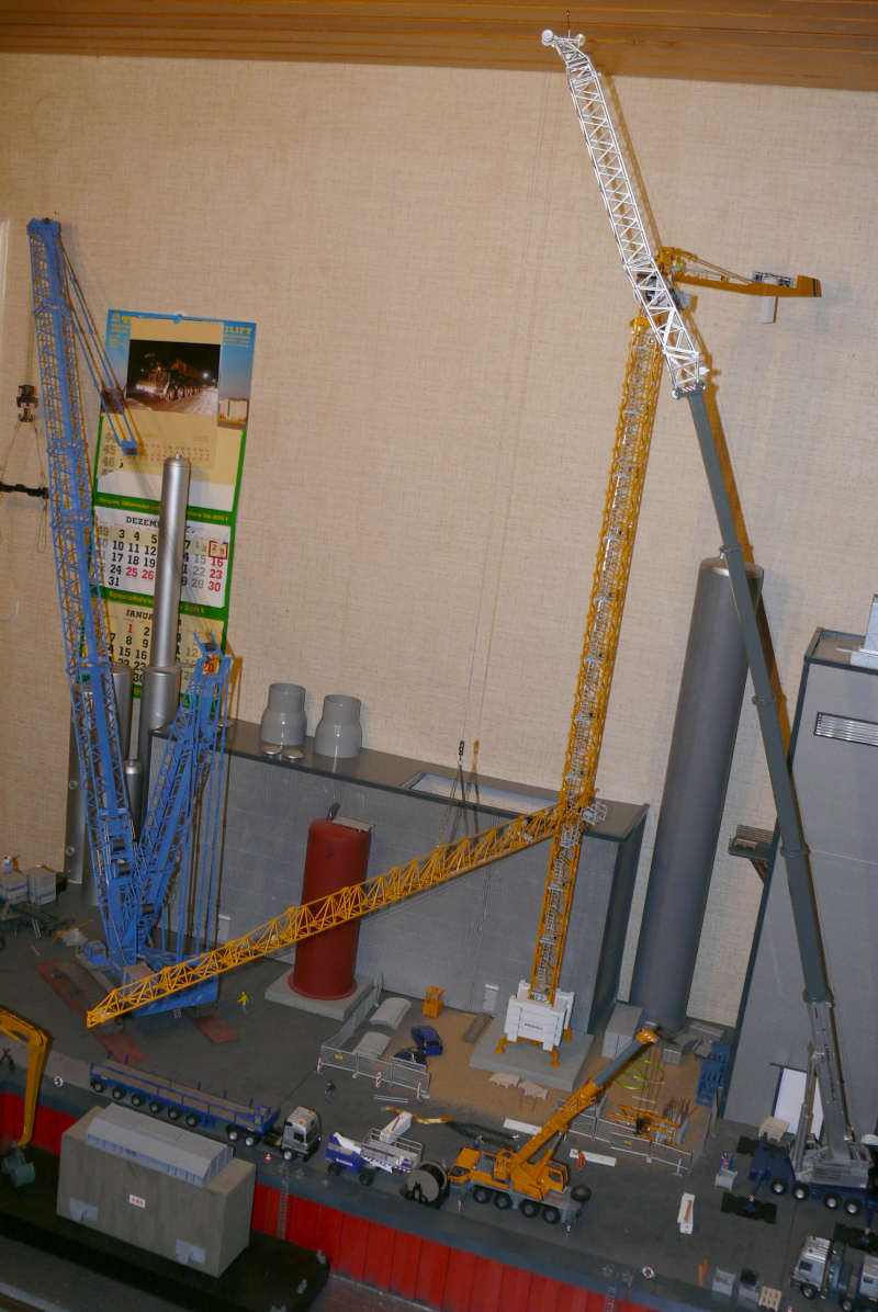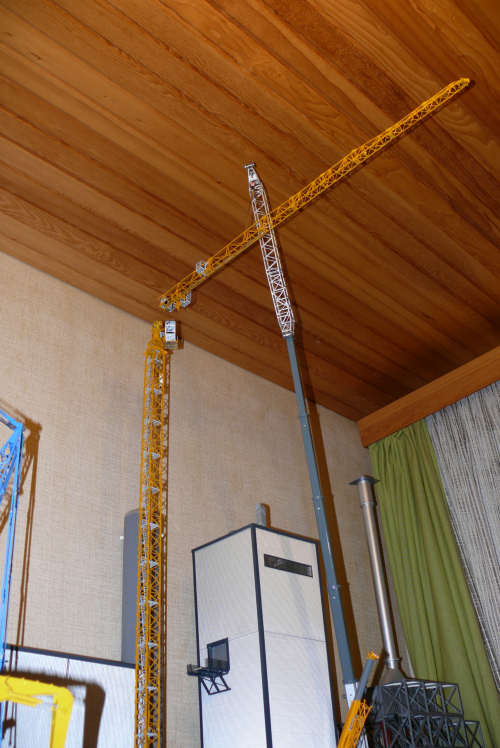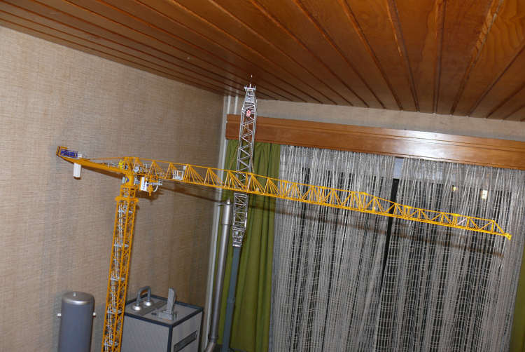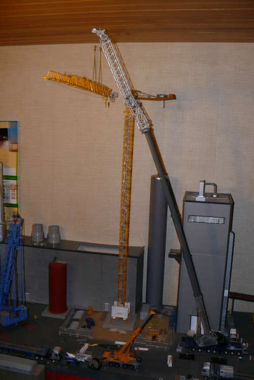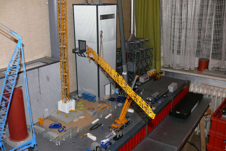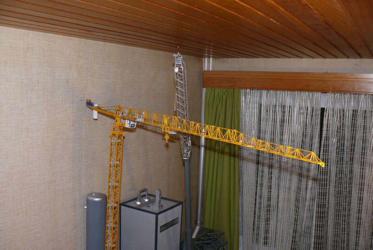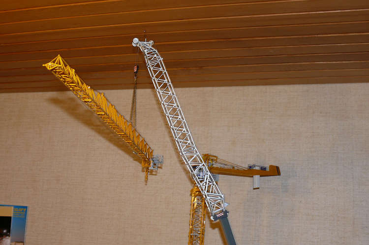 Nach erfolgter Verbolzung des Auslegers muß ein Monteuer in den Hauptausleger klettern um die Anschlagketten zu lösen