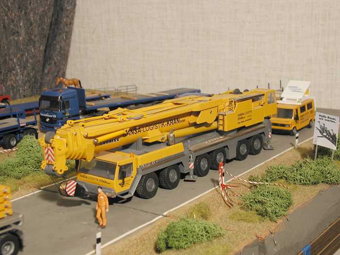 Da ist ja auch der dazugehörende Kran, ein Gerät in Liebherr Werksfarben,