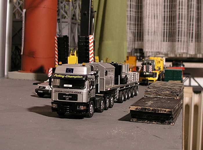 Kran und Begleitfahrzeug treffen am Einsatzort ein