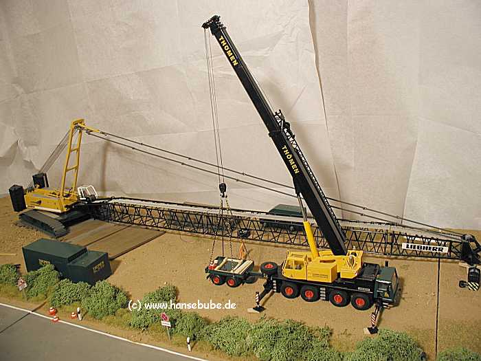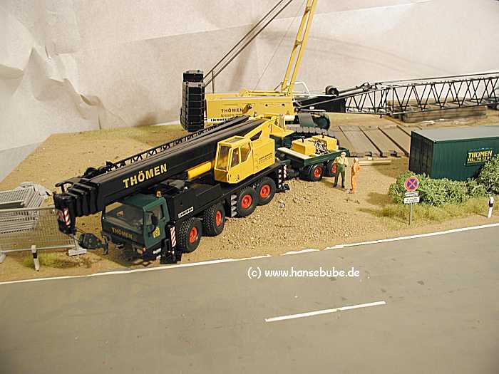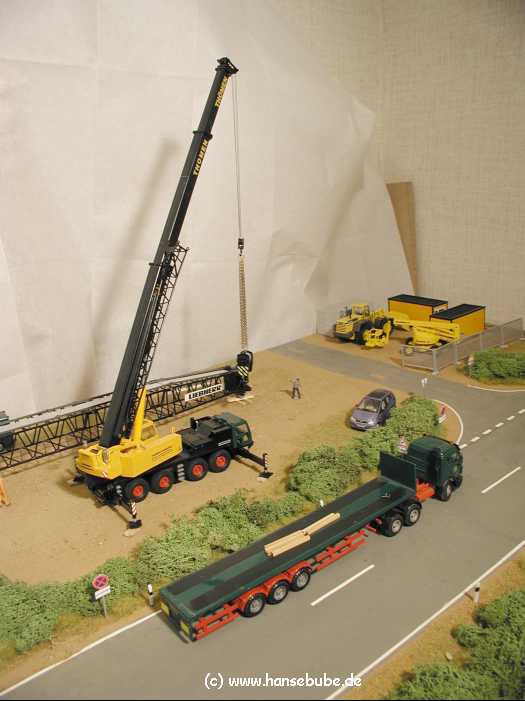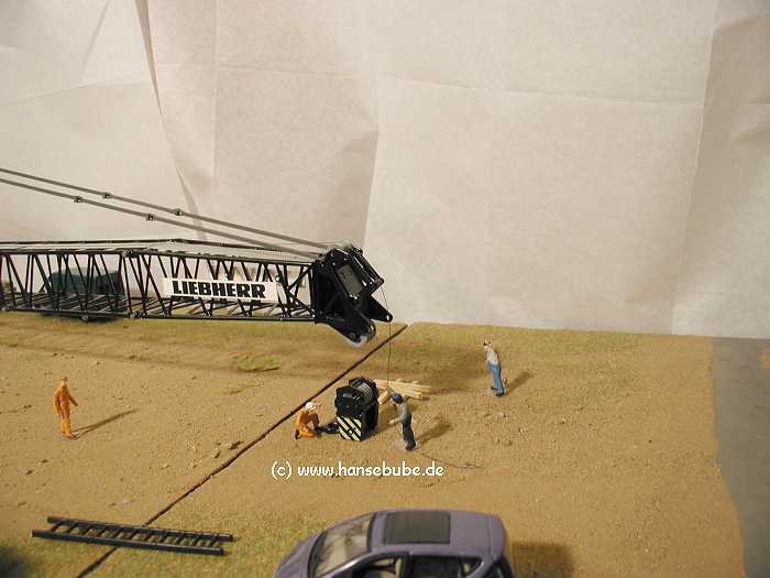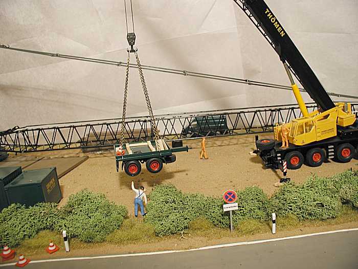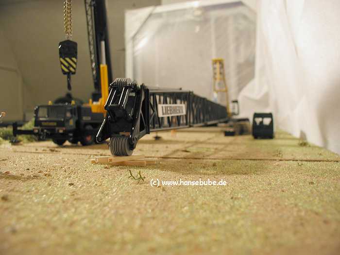 Der Hilfskran steht schon abfahrbereit am Werkzeugcontainer ,