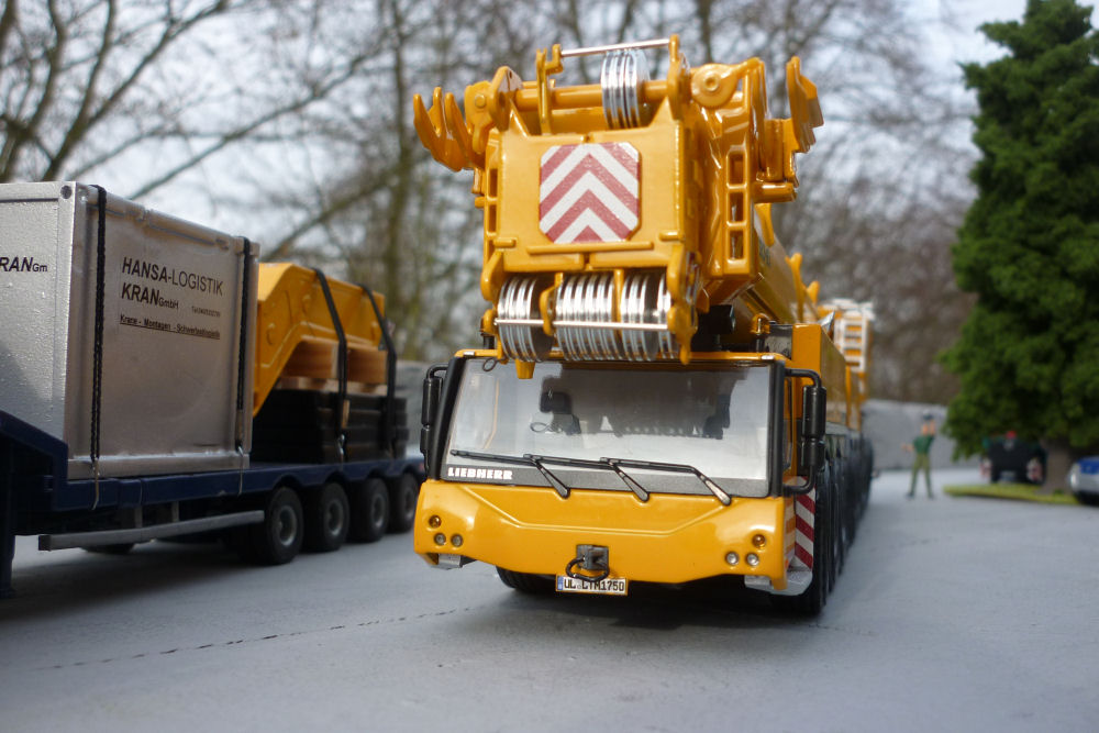 Der Kran wurde mit dem ersten Tieflader, beladen mit Stützen, Abstützmatten, Hakenflasche, Materialcontainer und
