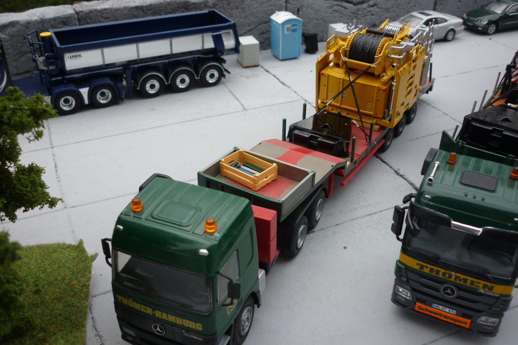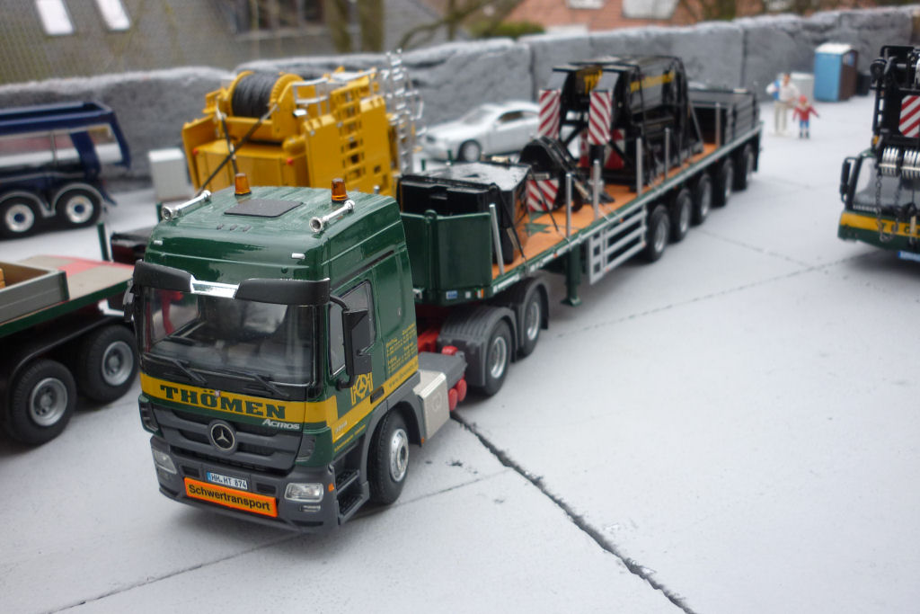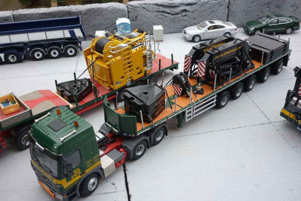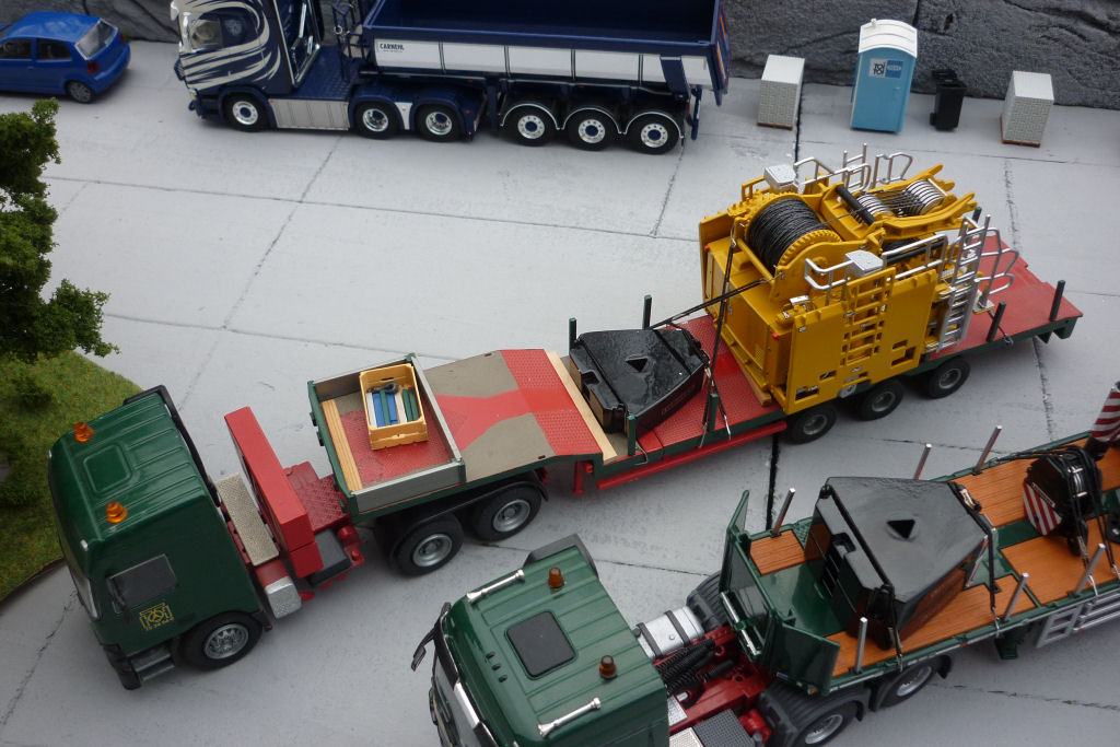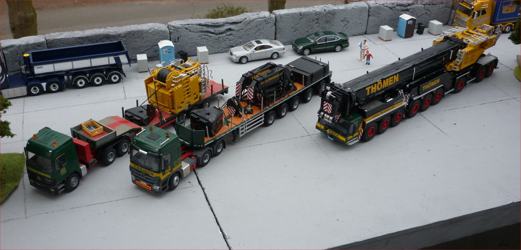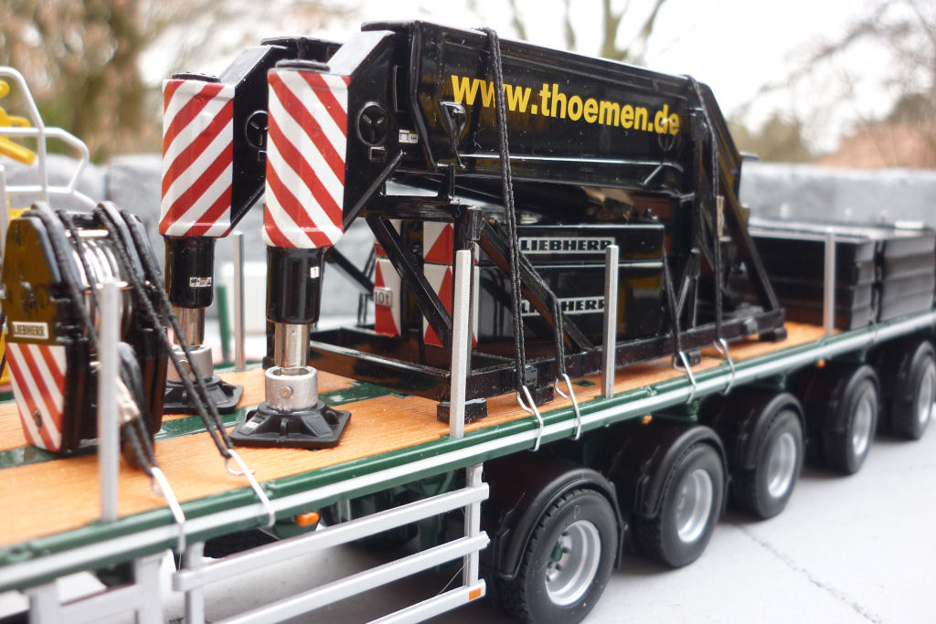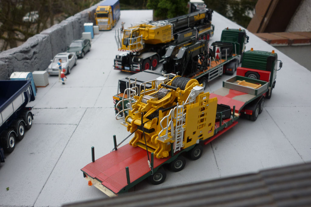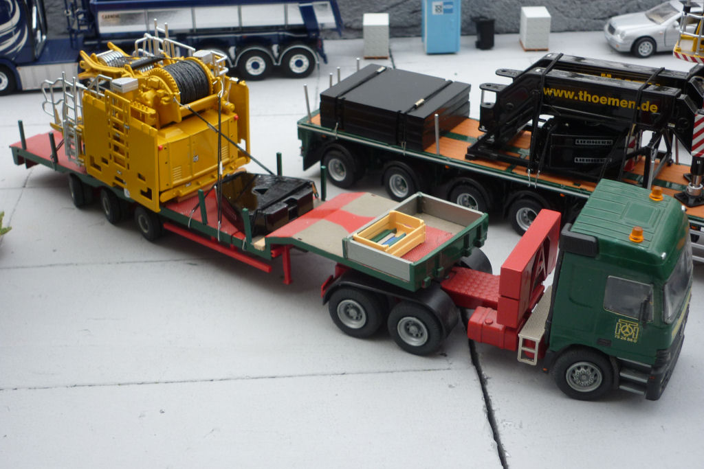 Kran in Transport, mit Ballasttiefladern