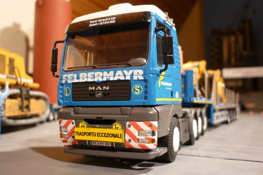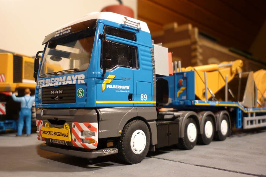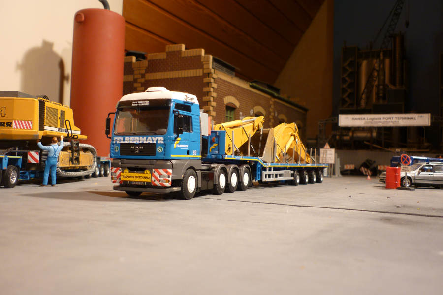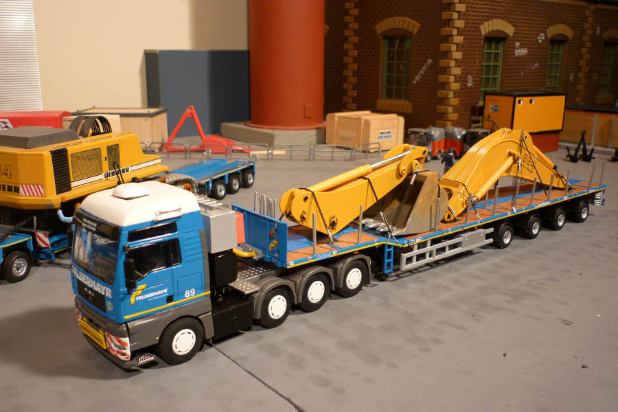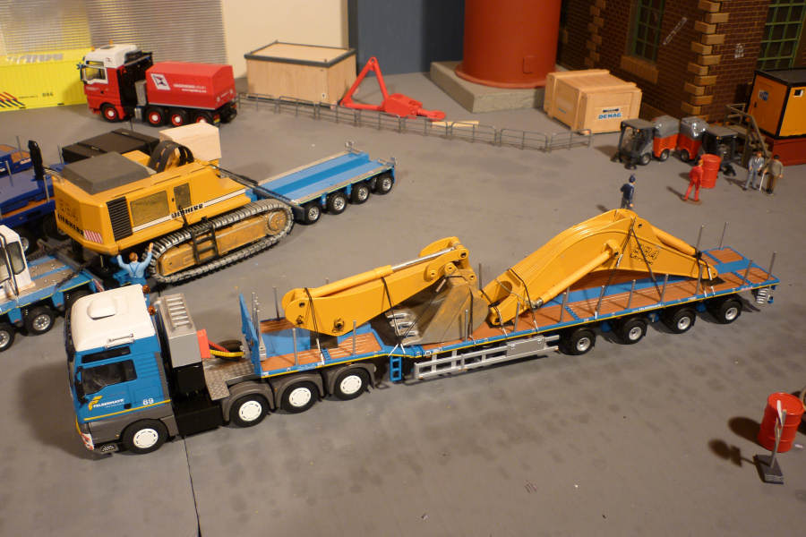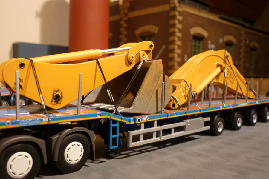 Das Tiefladermodell stammt von WSI, die Auslegerteile gehören zu einem Conrad Modell.