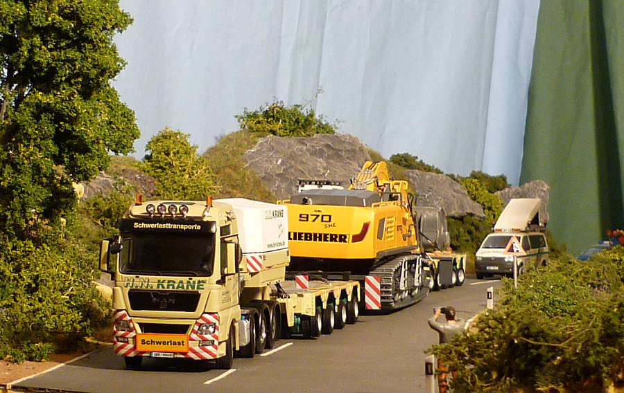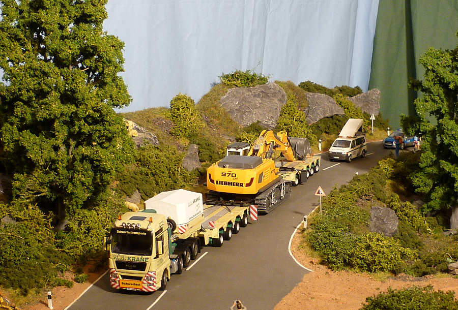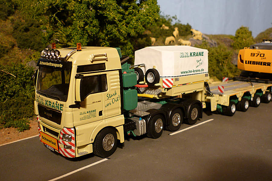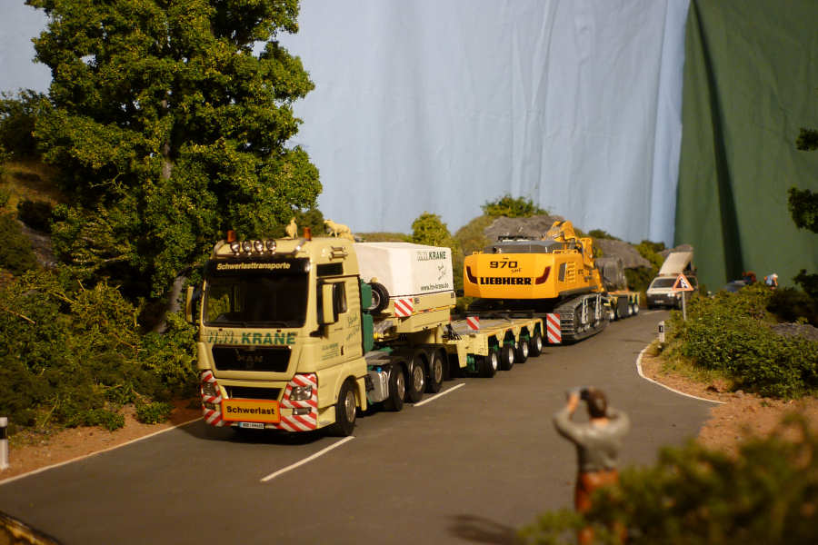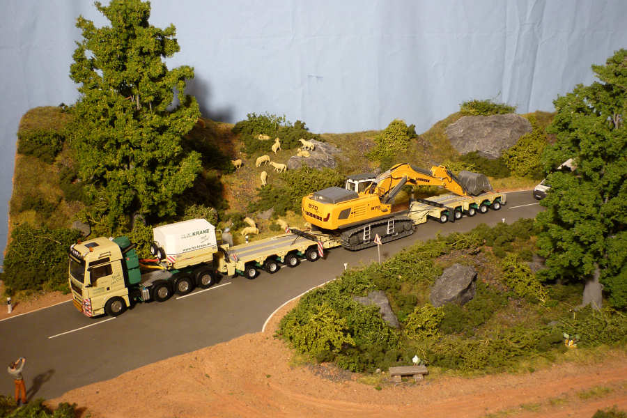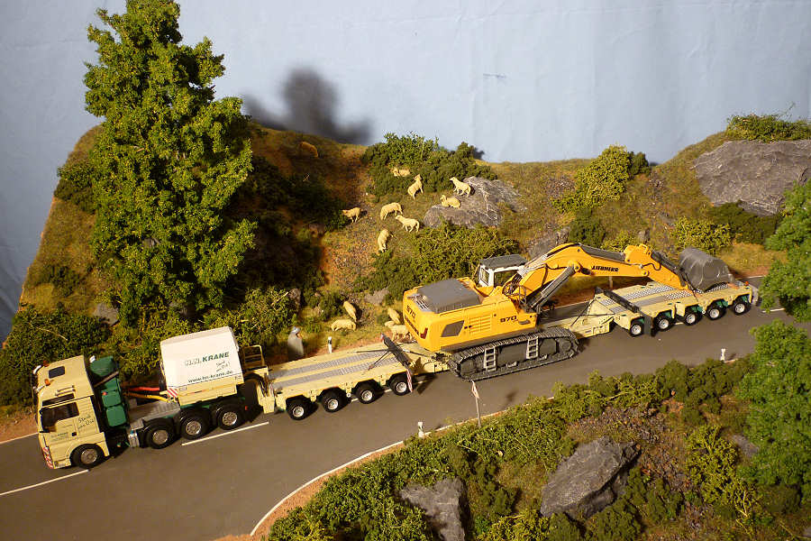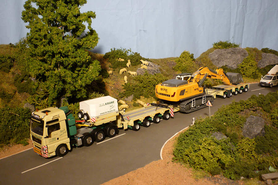 Der Liebherrbagger wurde dezent mit Abnutzungsspuren versehen und bekam auf dem Transport eine Ladungssicherung verpaßt.