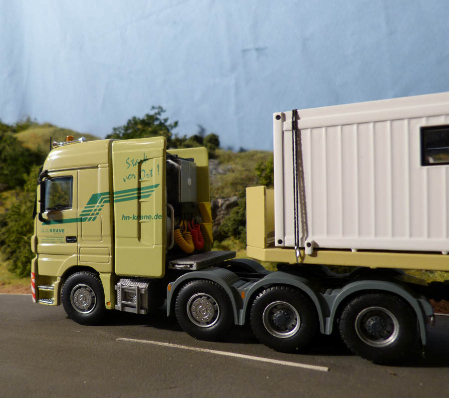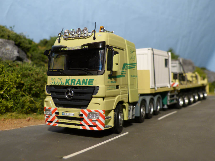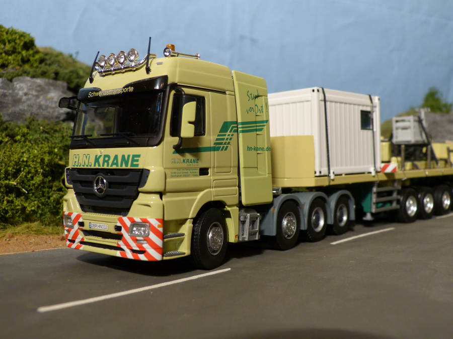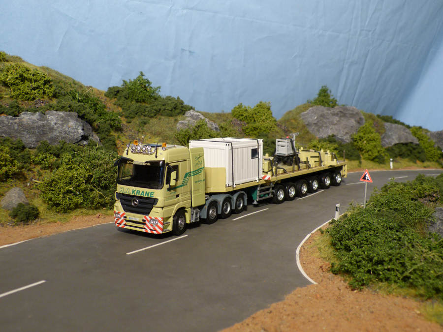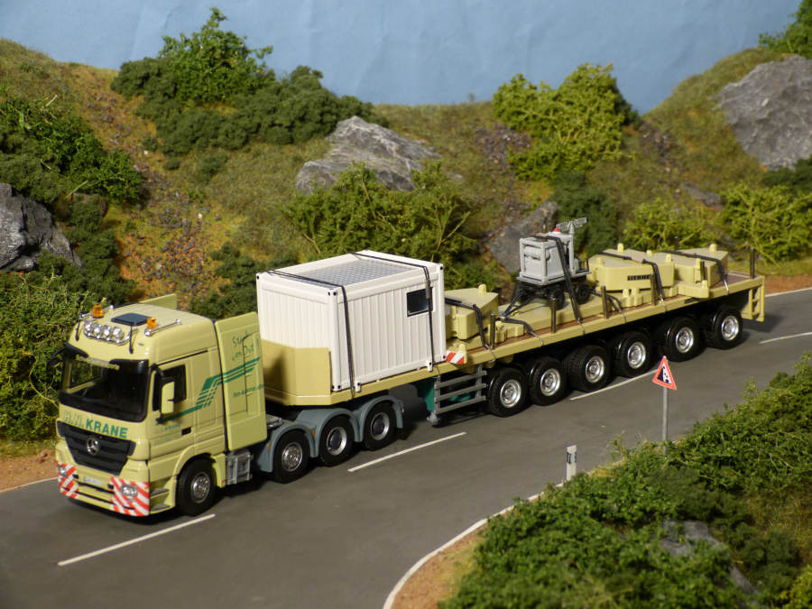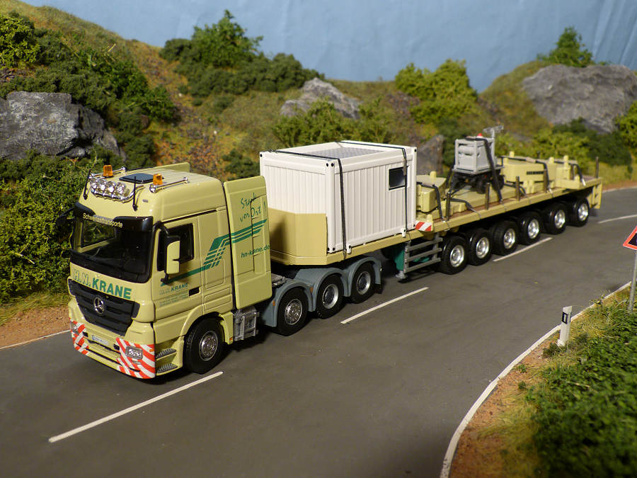 Hier ist die MB 4155 mit einem sechsachsigen Goldhofer Ballastauflieger und Kranzubehör unterwegs.