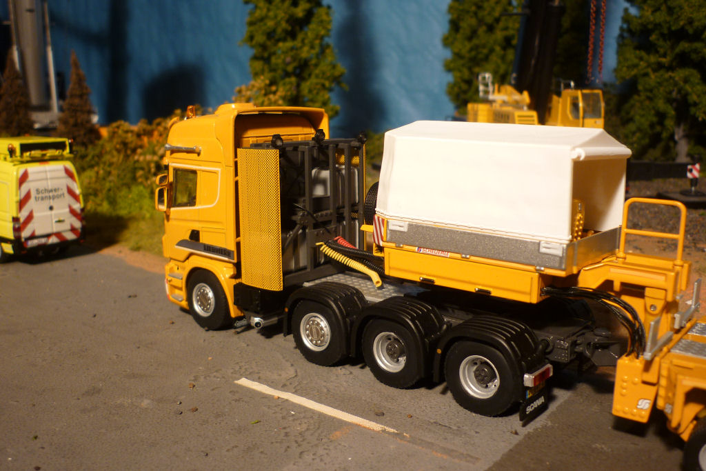 In dieser Variante wird der Bagger auf einer Kombination aus Scania R 730 8x4 und Scheuerle Intercombi 4-6 Sattelroller