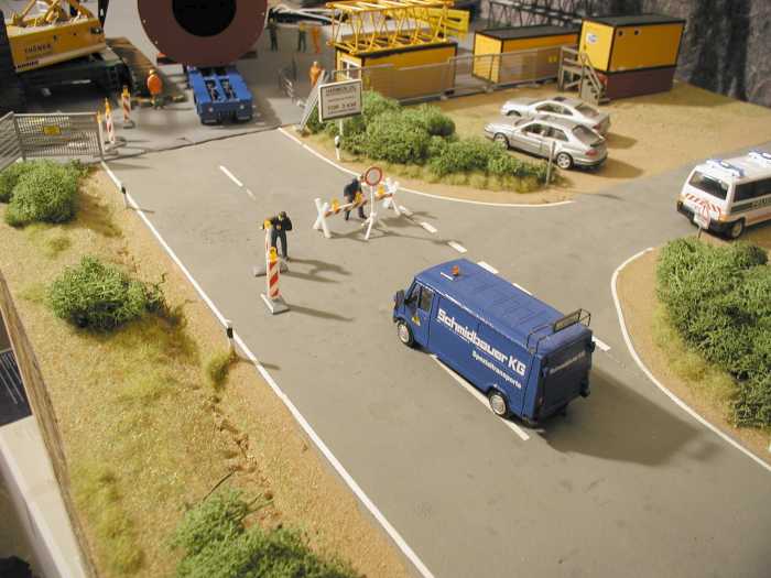 Die Absperrungen werden wieder aufgestellt ,doch halt das Begleitfahrzeug muß noch mit auf die Baustelle