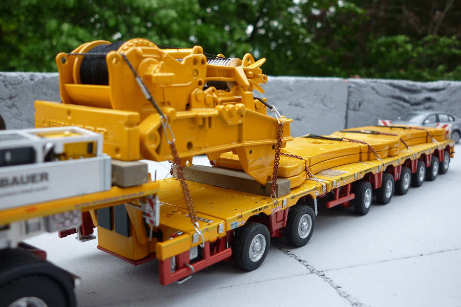 Die beiden Tieflader wurden mit Zubehör vom LTM 1500-8.1 beladen, die Ladungssicherung