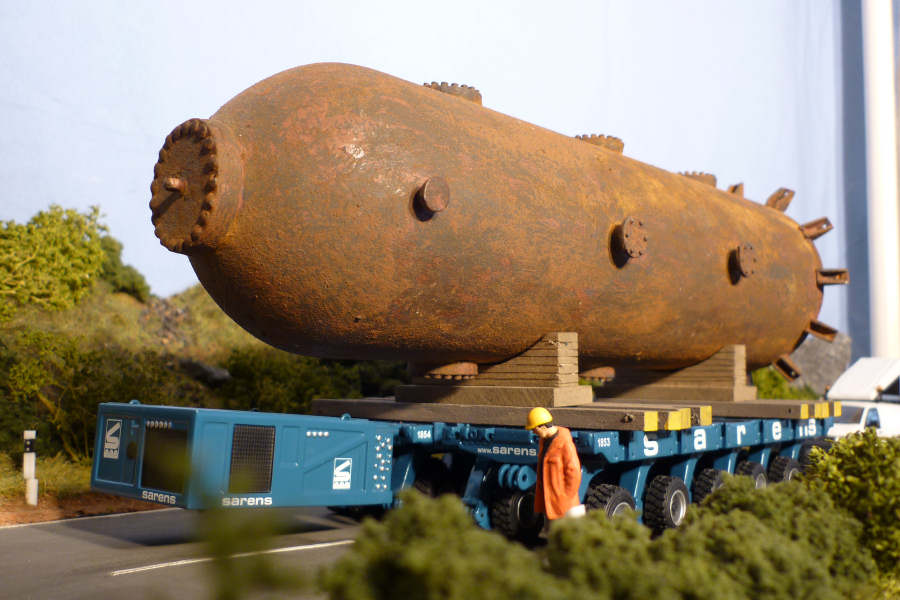 Hier wird ein alter Druckbehälter auf einer Scheuerle SPMT Kombination von Sarens transportiert.