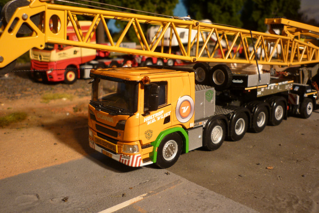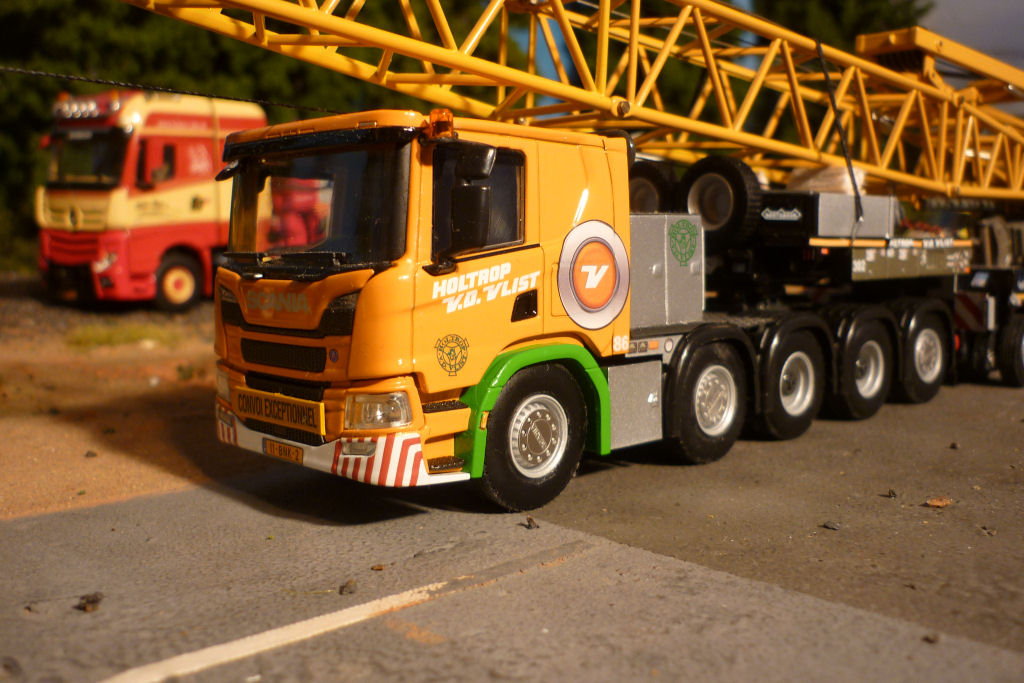 Das Modell der fünfachsigen P 450 Flachdach Scania Zugmaschine mit Nooteboom 1/5 Euro ICP Tieflader, erschien wenige