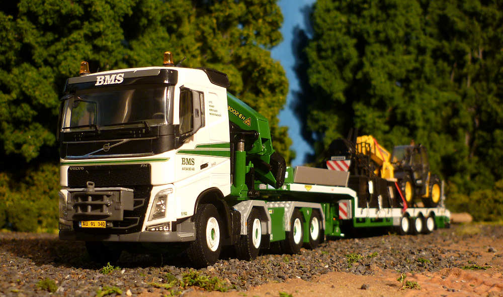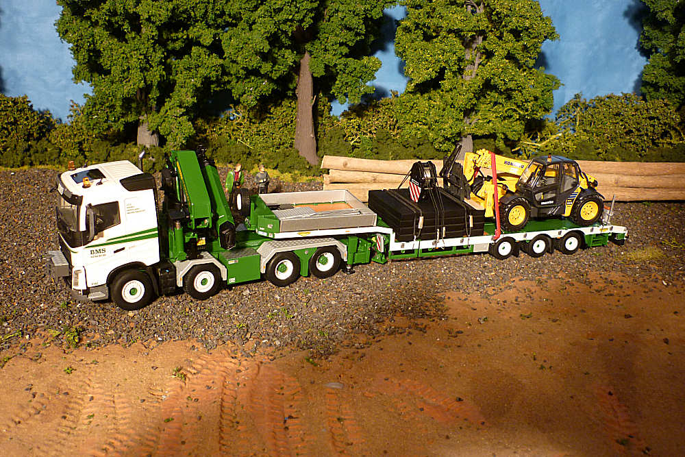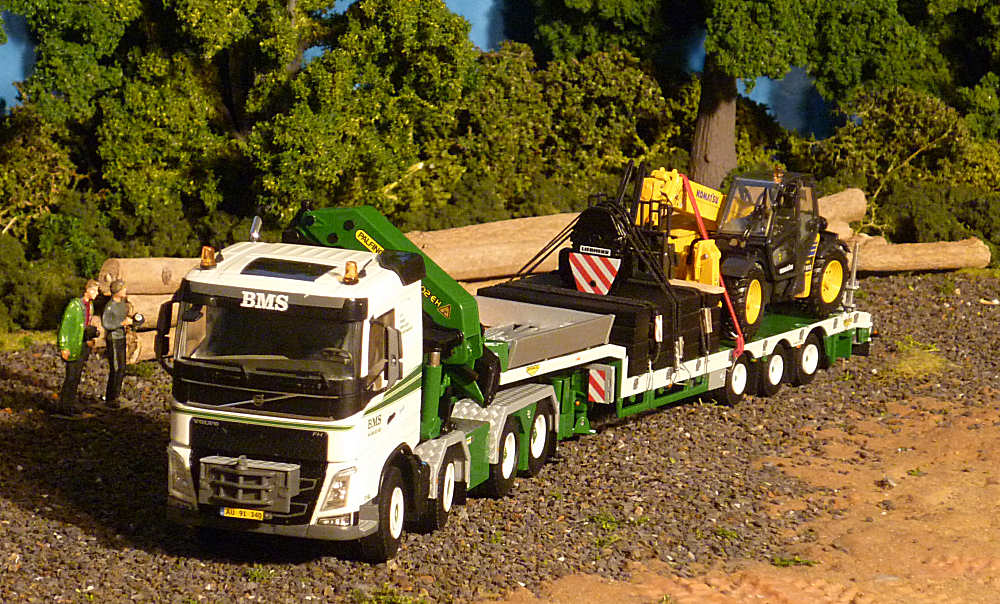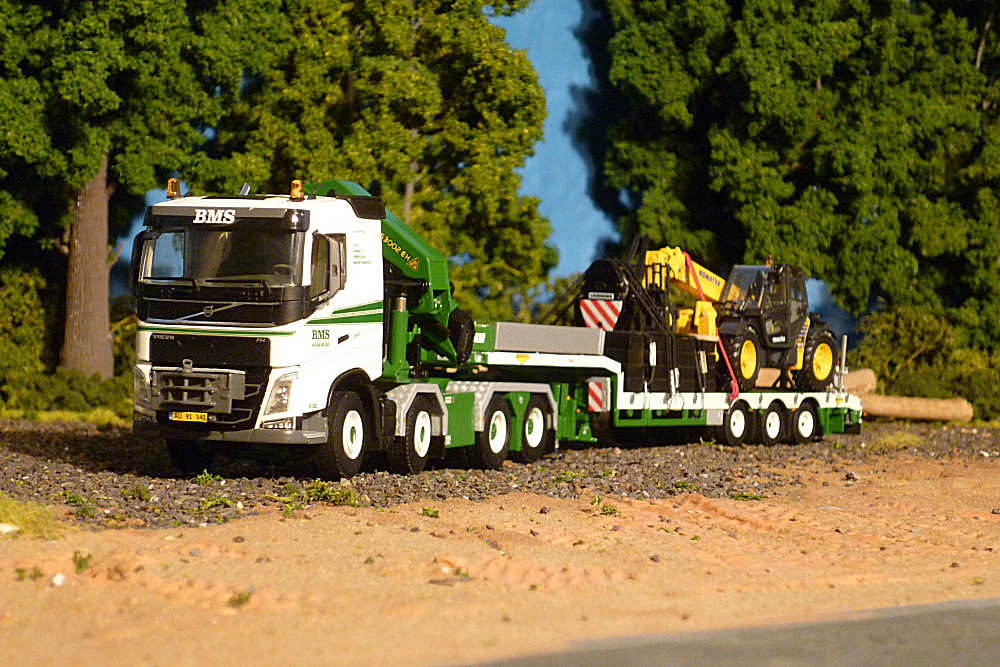Dieses Modell einer Volvo FH 16 540 Euro 6 Kranzugmaschine mit dreiachs Broshuis Semitieflader