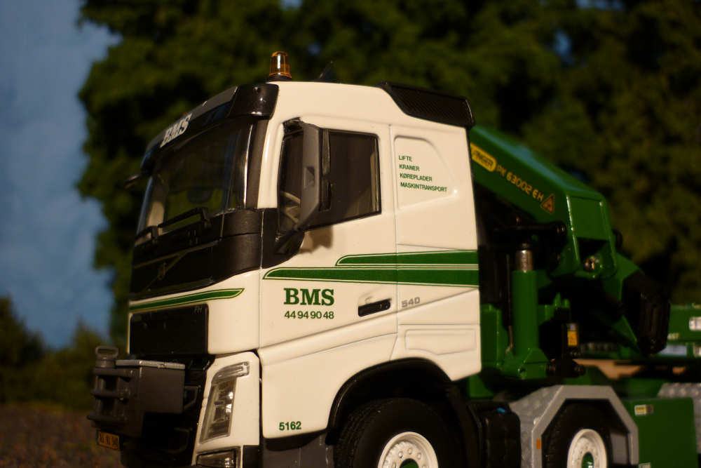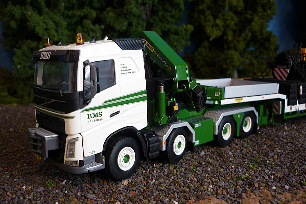 Der nachgebildete Ladekran auf der Zugmaschine ist ein Palfinger PK 63002 Eh Schwerlastladekran, welcher voll beweglich ist.