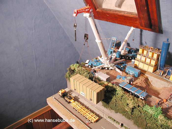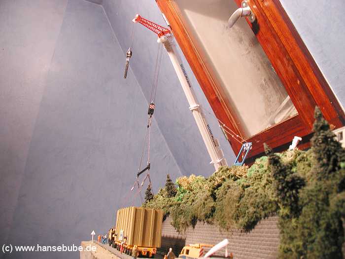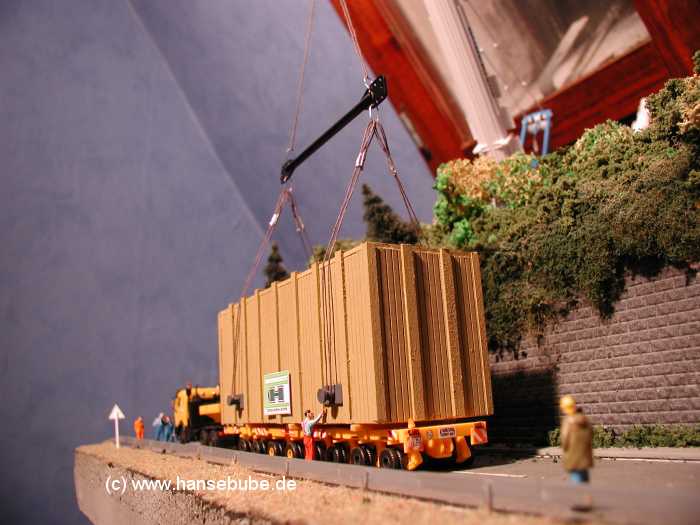 Doch halt , erst müssen noch Kanthölzer auf der Ladefläche des Selbstfahrers ausgelegt werden .