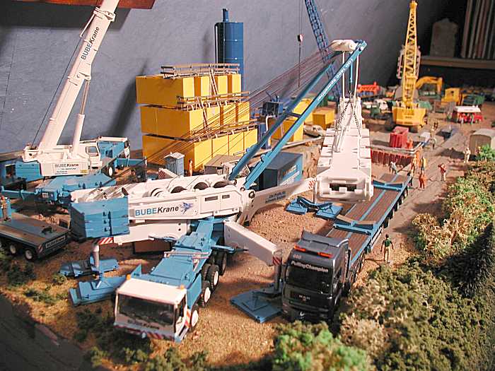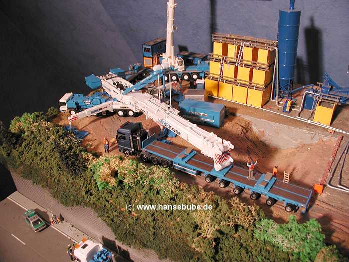 Der Rollenkopf des Teleauslegers wird kurzfristig auf dem Nooteboom abgelegt