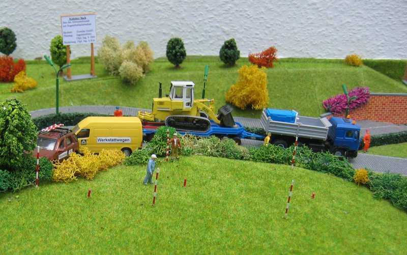 Der Polier telefoniert mit der Baufirma wann die Laderaupe kommt.