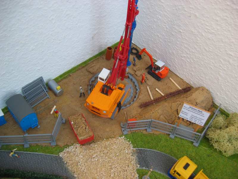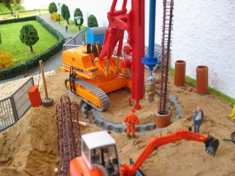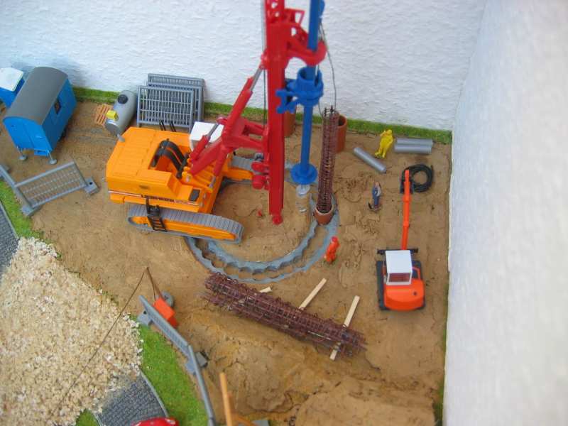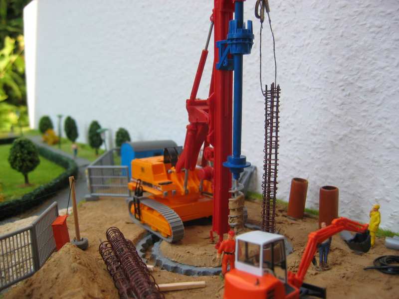Das erste Bohrloch hat seine Tiefe erreicht und so kann gleich der Bewehrungskorb eingebaut werden.