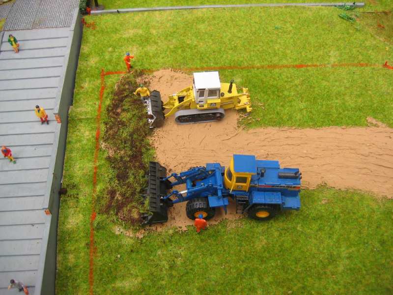 Der Radlader und eine Laderaupe ,als Unterstützung, bei der Abtragung des Mutterbodens.