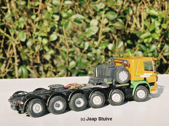 Zugmaschine und Tieflader sind Eigenbauten aus Messing,