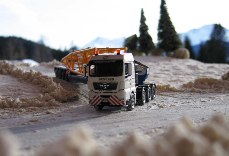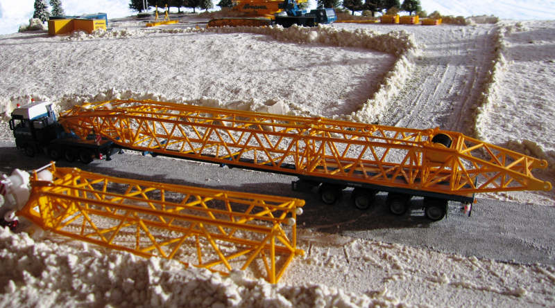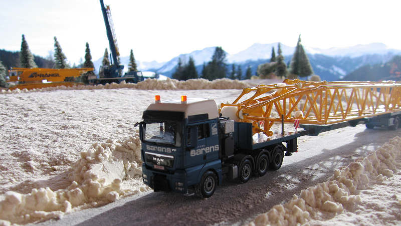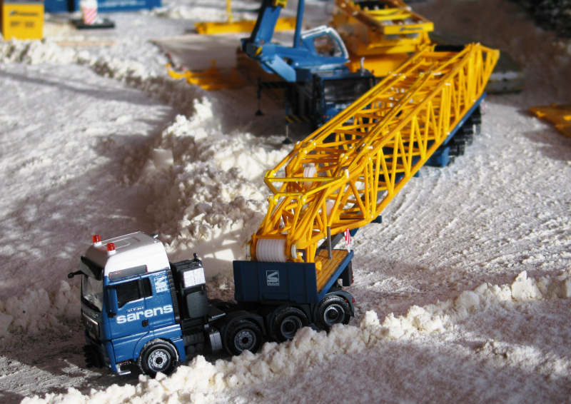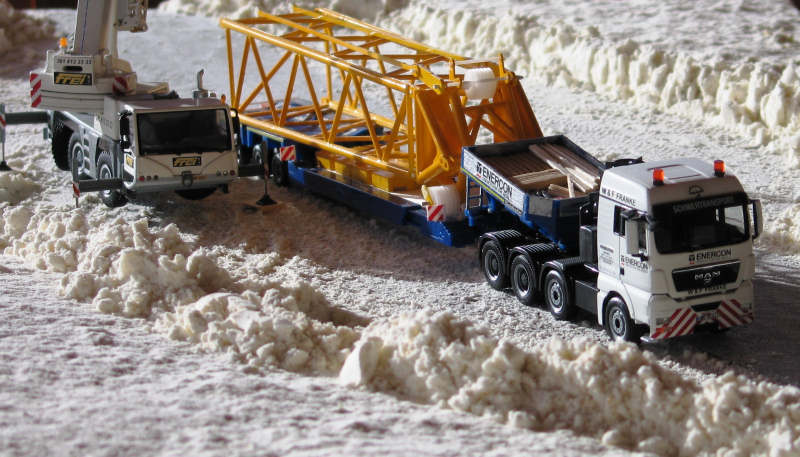 Thema auf dem eingeschneiten Diorama ist Anlieferung von Raupenkranteilen