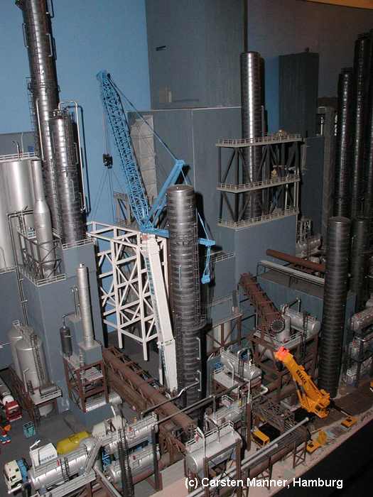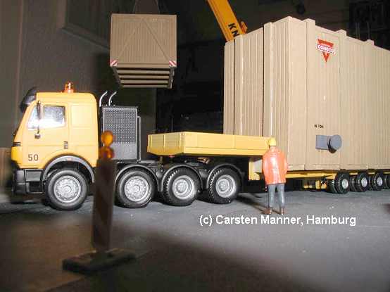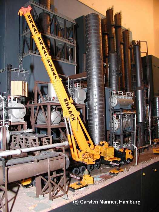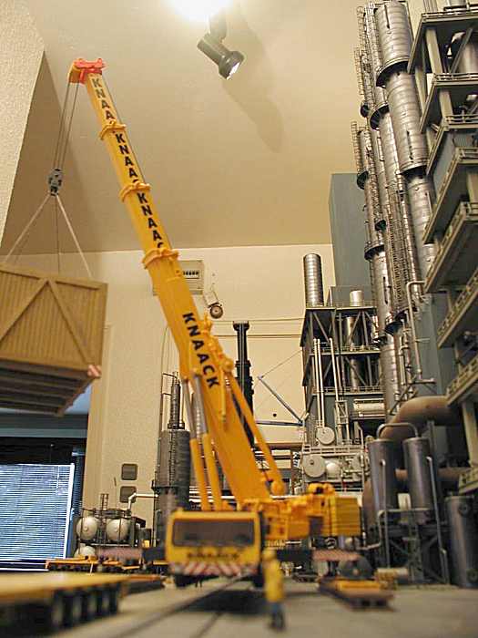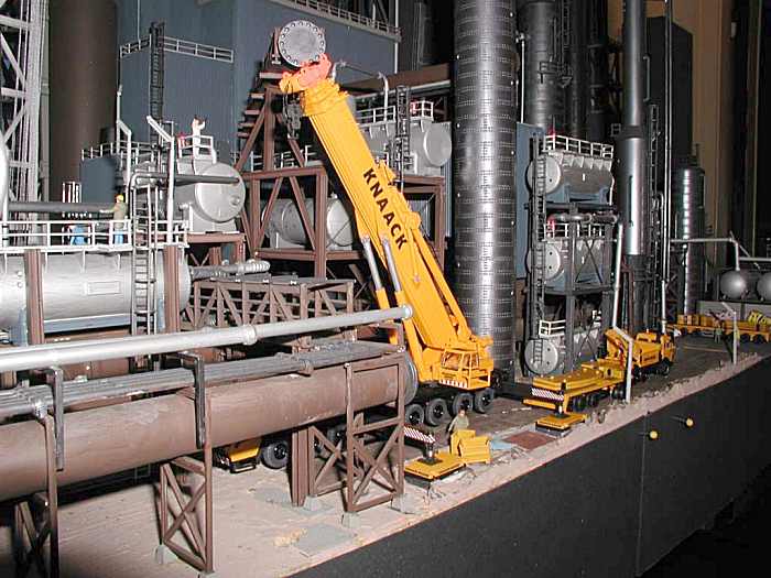 der vordere Teil des Kranes mußte bei aufgerichtetem Mast unter eine Rohrbrücke gefahren werden.