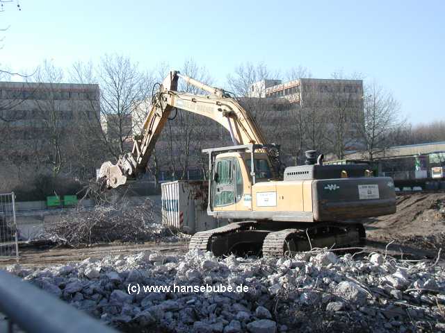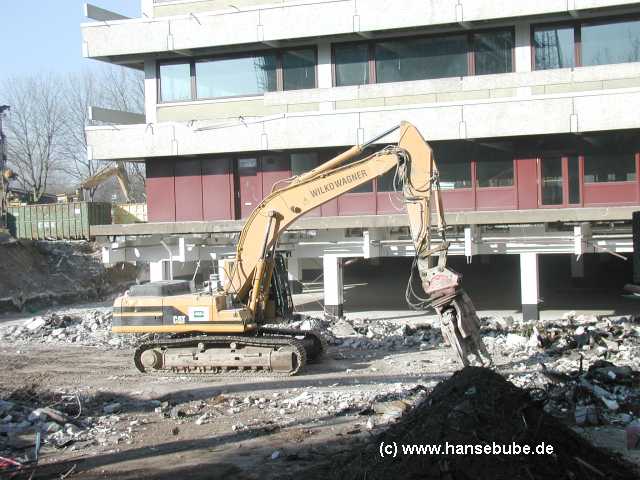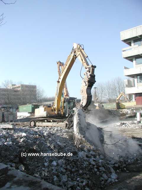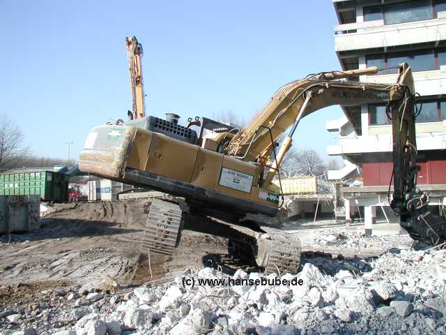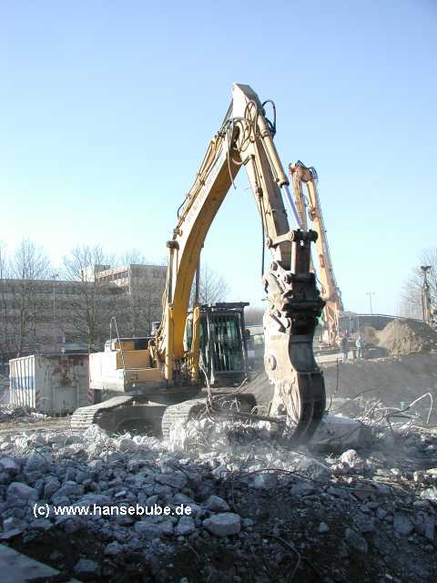 Der Komatsu zieht sich ein großes Betonteil heran und hebt dabei ein wenig ab ...