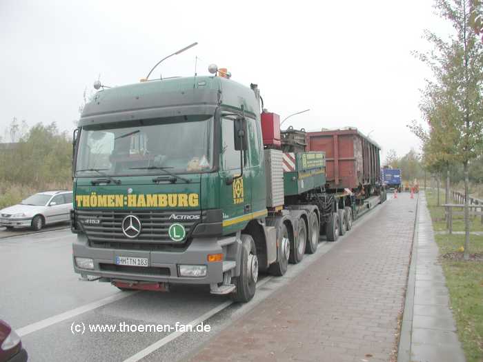 Ein fertig beladener und abfahrbereiter Transport ,gezogen von einer DC Actros Titan