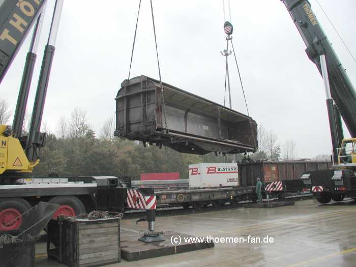 Der Waggon wird auf einen bereitgestellten Schwerlastwagen geladen