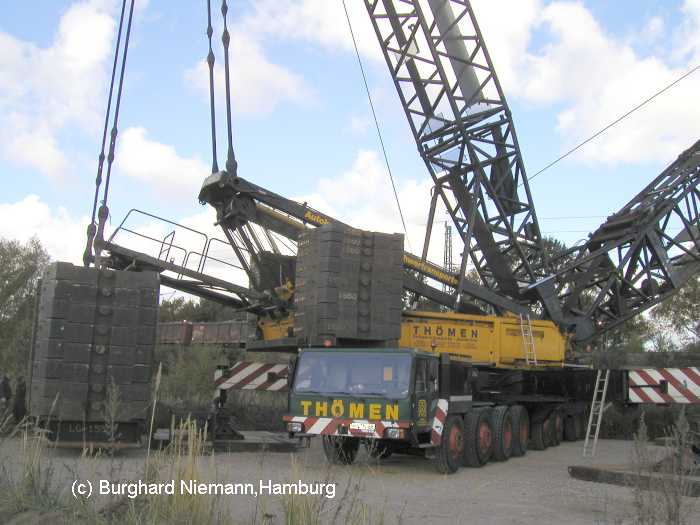 Zum Aufnehmen der Last wurde mit 250 t Schwebeballast gearbeitet.Der Ausleger mit dem Waggon am