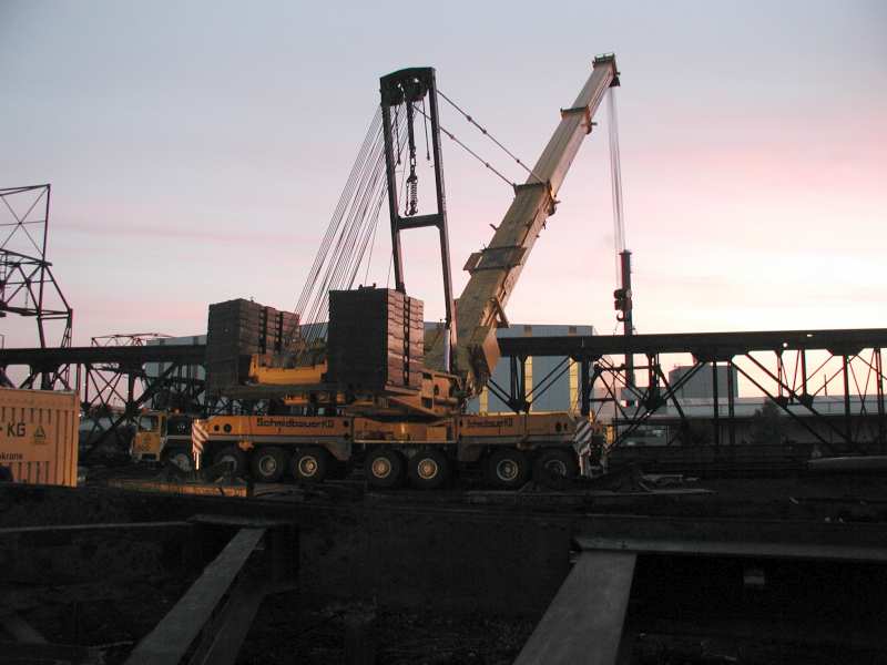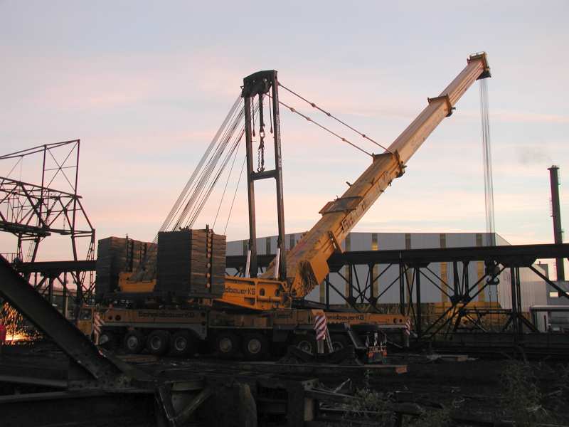 Noch ein wenig Schieben und drücken und die Kranbahn liegt am Boden.