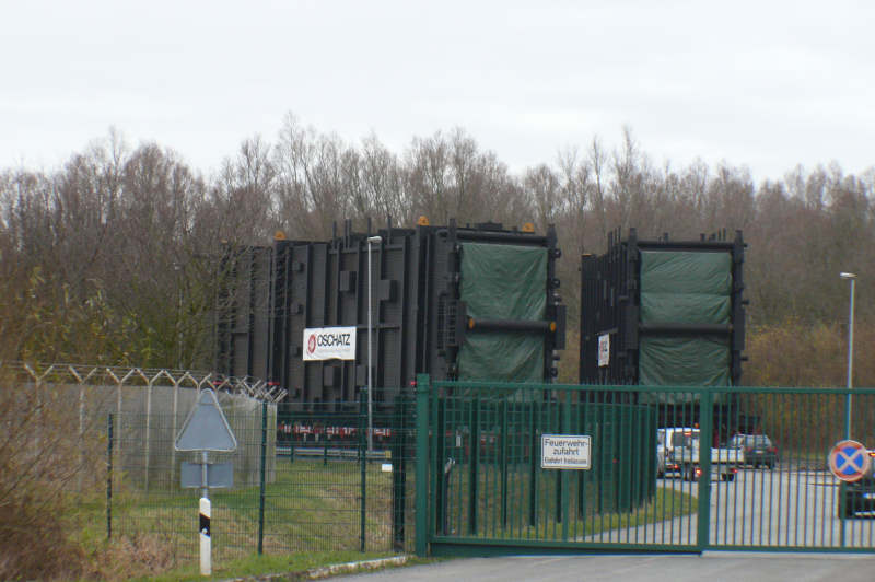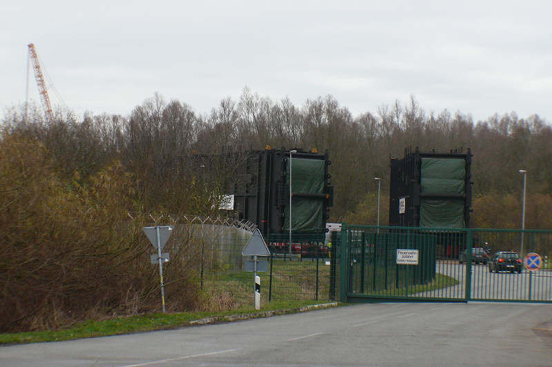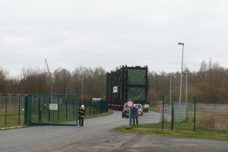 Der Transport verschindet im Werkstor im Hintergrund ist der Ausleger des CC 6800 von Schmidbauer zu sehen,