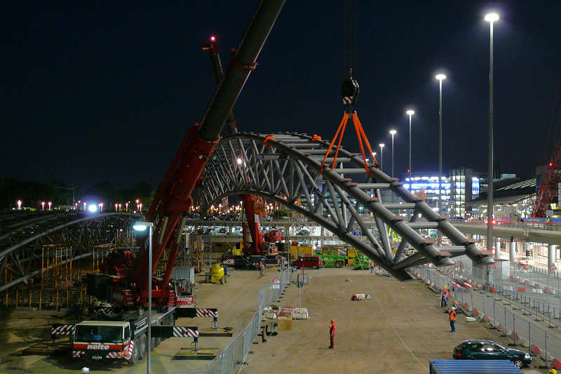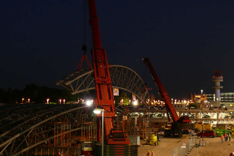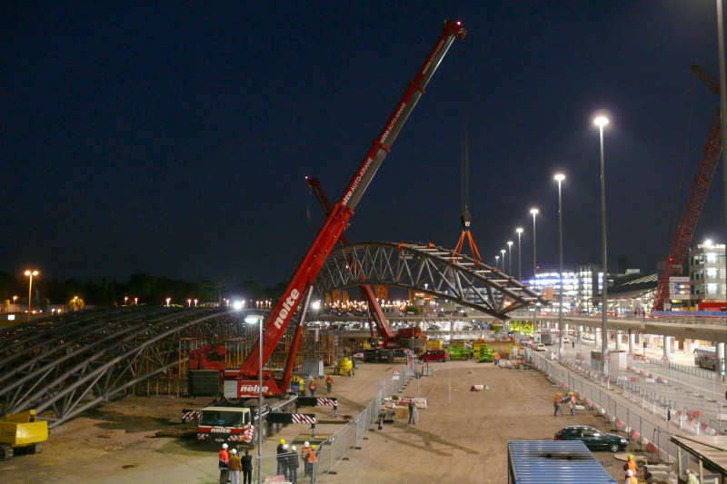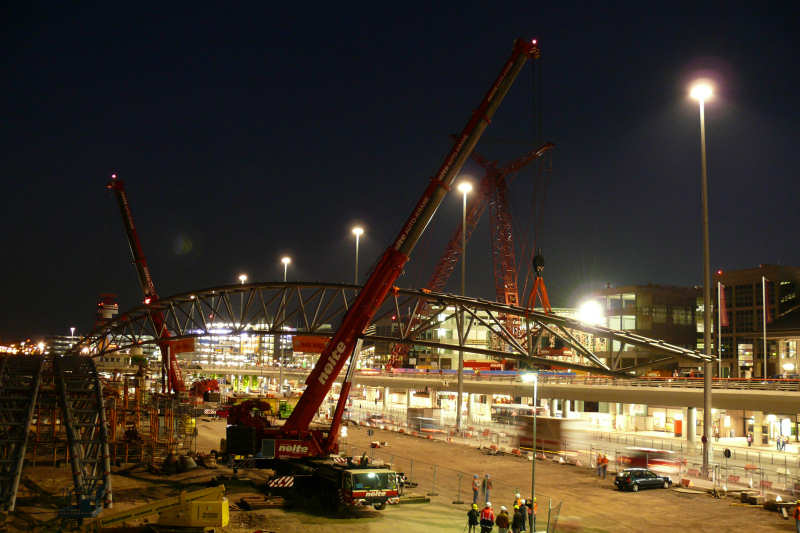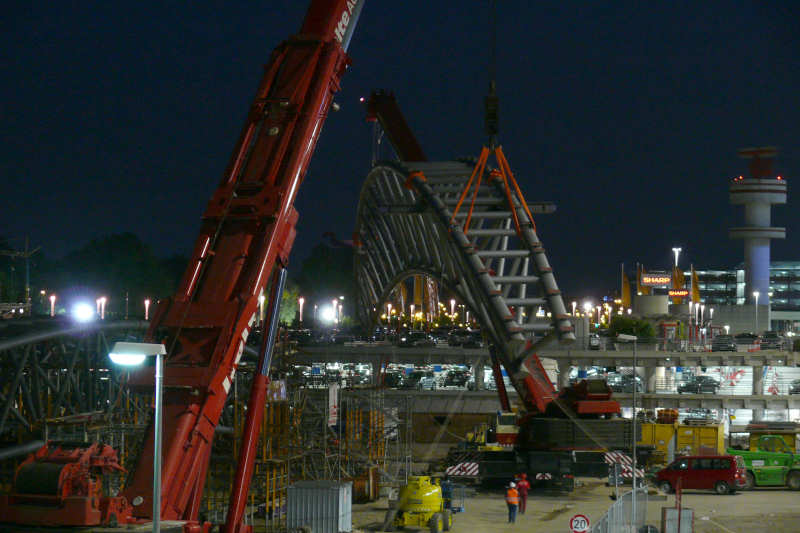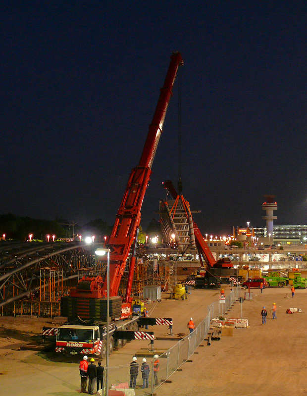 Langsam aber sicher wurde der Binder von beiden Kranen angehoben, auf die andere Seite geführt und in Übergabeposition