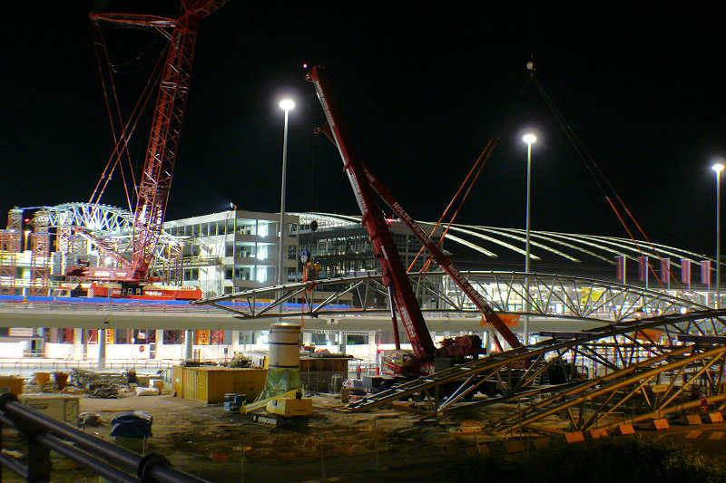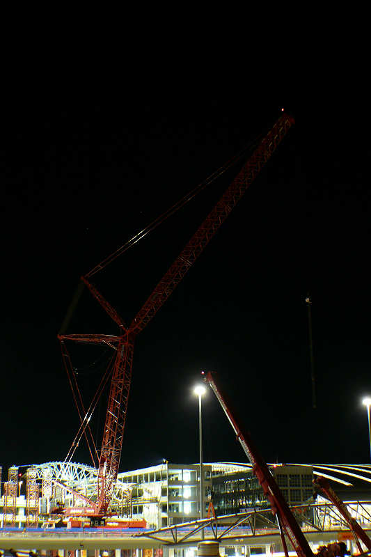Nachdem der LG den Binder übernommen hat, schwenken die Hilfskrane aus dem Arbeitsbereich und der Hub kann beginnen