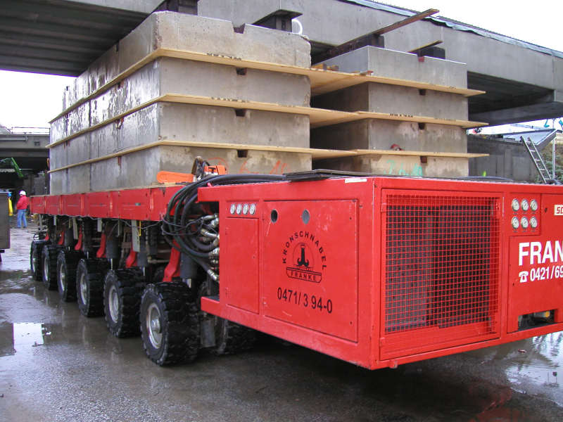Einen Tag später, die SPMTs stehen mit dem ersten Brückenteil bereit zum Einbau