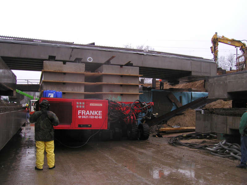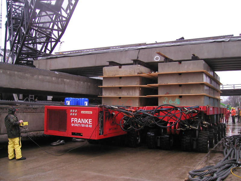 Langsam fährt der Transport Richtung Widerlager, in der Nacht zuvor waren alle Hilfsbrücken und die Gleise ausgebaut worden.