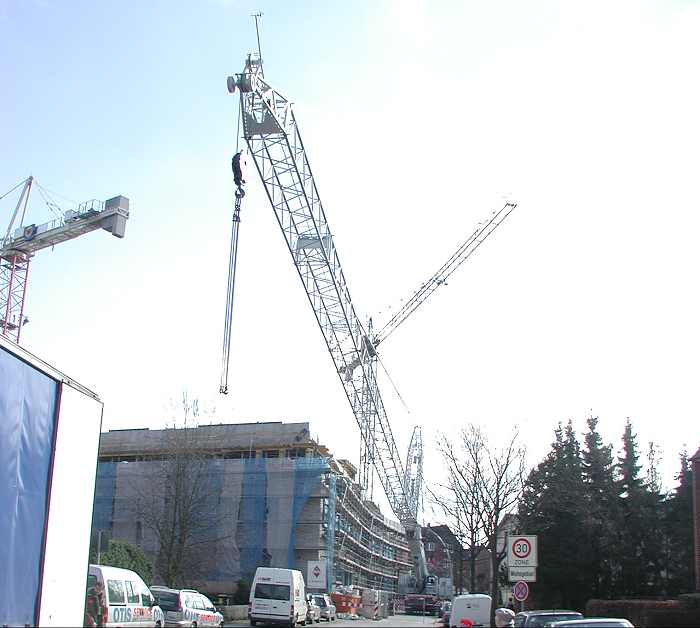 Der 250 t Telekran war mit 100 t Ballast und 50 m langer Gitterwippspitze aufgerüstet worden,