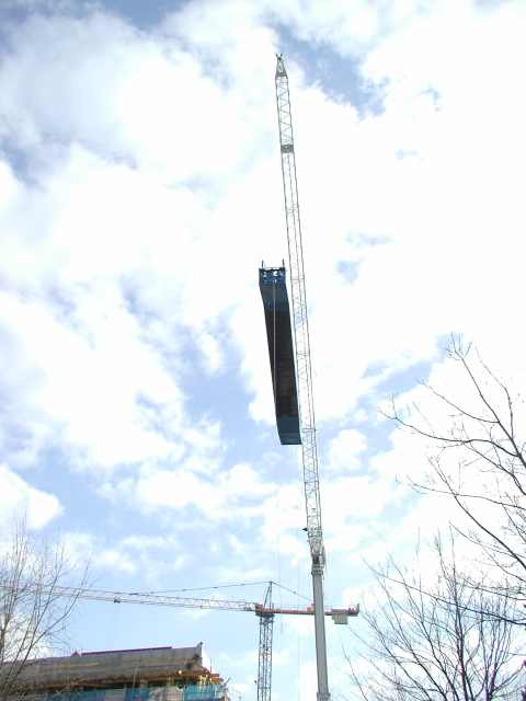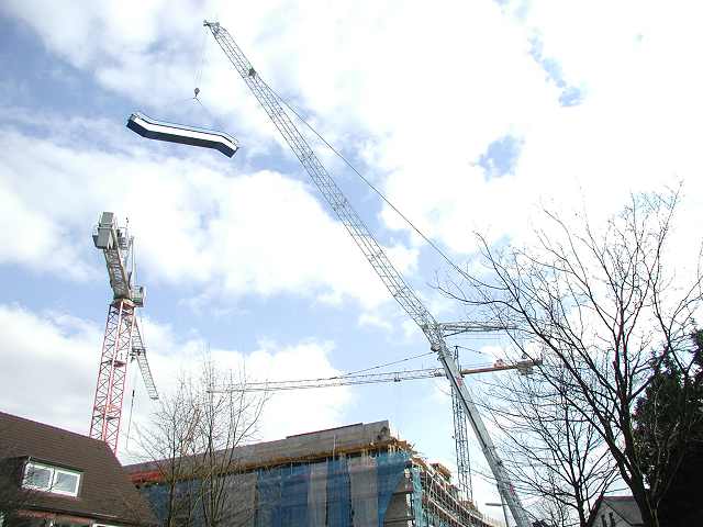 Dann endlich schwebte die erste Fahrtreppe ihrem Einbauort entgegen.