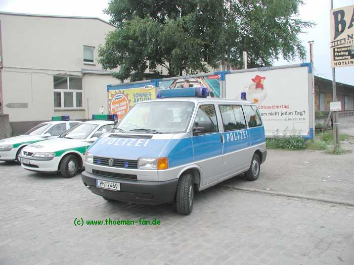 Mehrere Streifenwagen,darunter auch dieser VW T 4 in neuem blauweissen Design