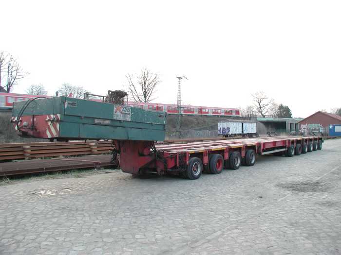 Von diesem Auflieger werden die hinteren sechs Achsen abgebolzt um aus der ersten Kombination einen