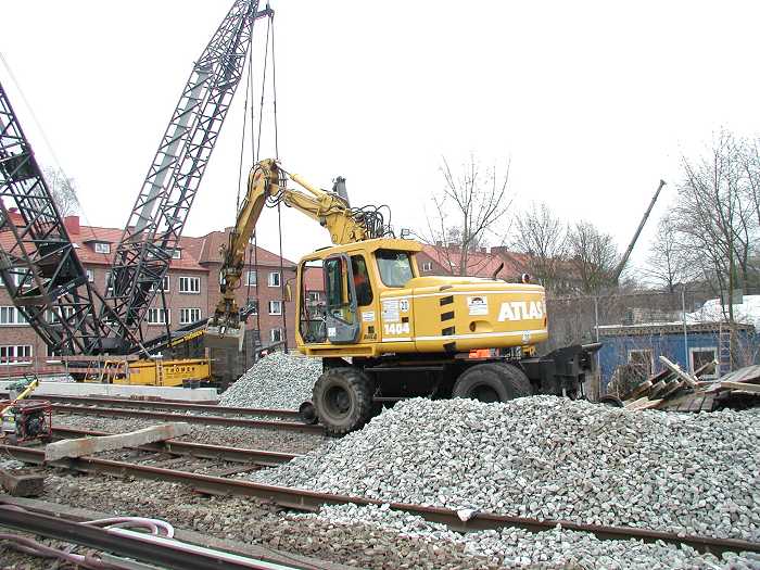 Noch während des Hubes begannen Zweiwegebagger Schotter zwischen den Gleisen aufzuhäufen