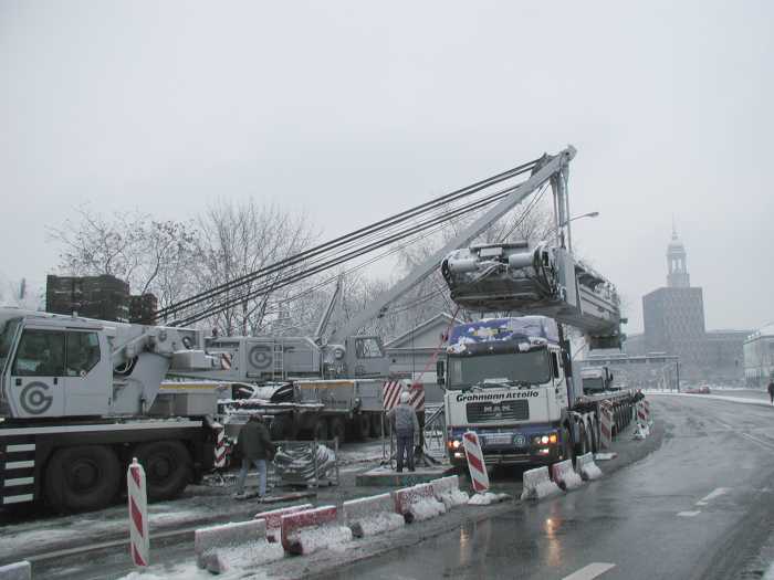 Die Montage des Mastes begann just in diesem Moment