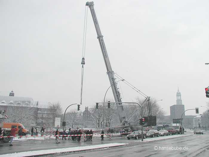 Der Kran ist zugbereit die Anschlagseile zur Aufnahme der Traverse hängen bereits an der Hakenflasche