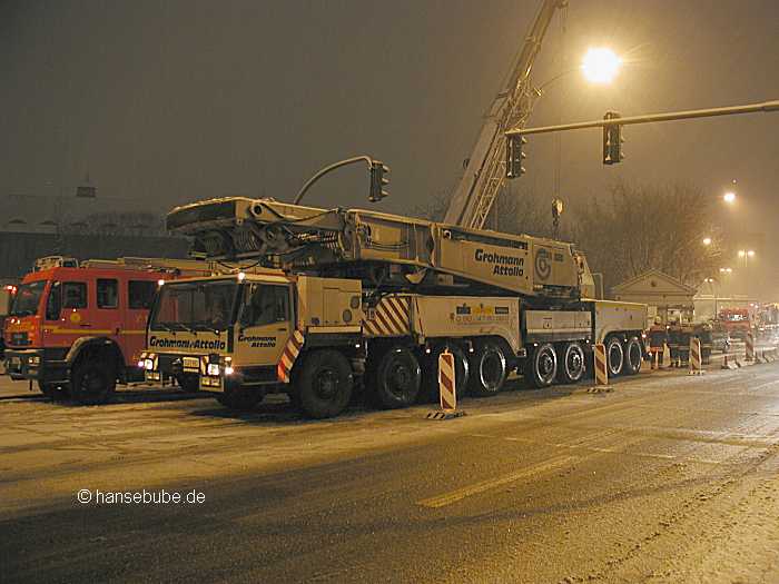 Kurz nach 04.00 Uhr, der LTM 1800 und drei Begleittieflader treffen an der Baustelle ein