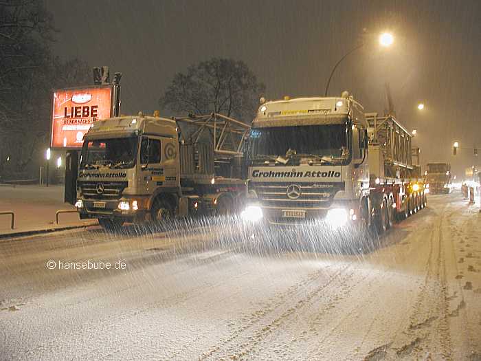 Zwei Tieflader mit Zubehör, bei dichtem Schneegestöber ...