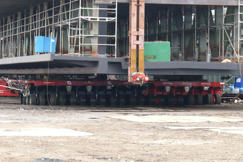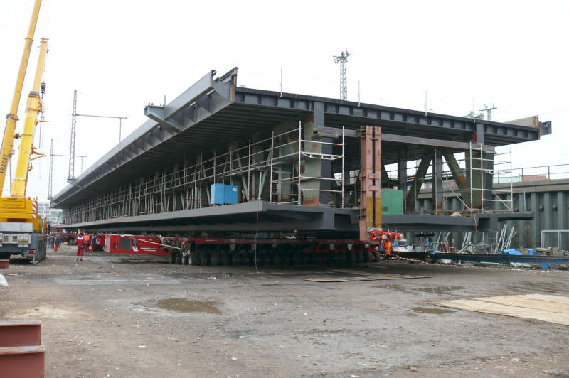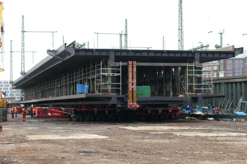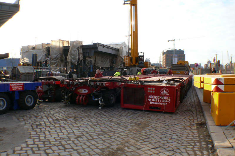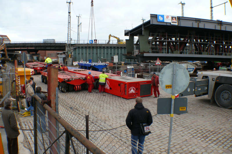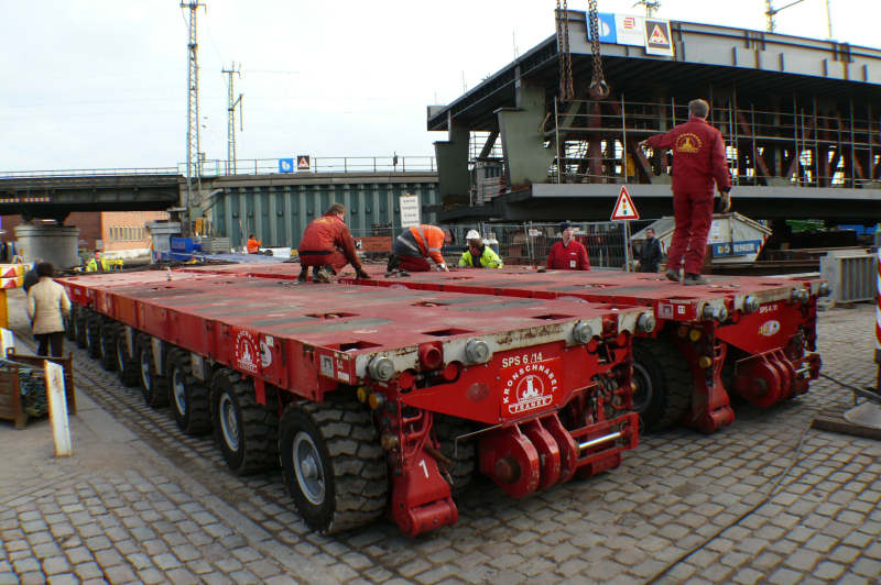 Oberhafenbrücke in Hamburg, mit Hilfe von 80 SPMT Achslinien vom Montageplatz zum