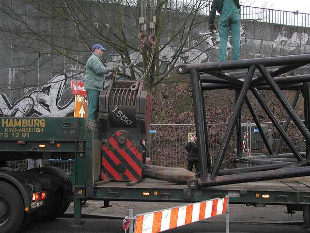 Es geht dem Ende des Aufrüstens entgegen,der Tieflader mit der Hakenflasche und der Auslegerspitze