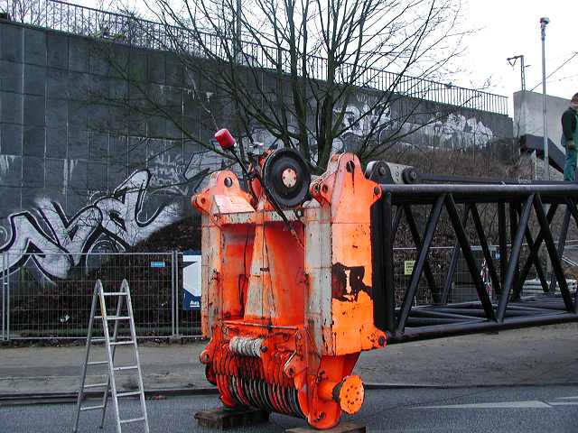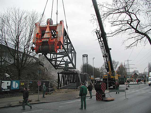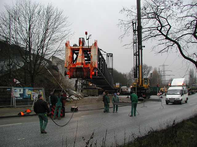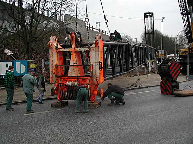 Nachdem alle Abspannstangen verbunden wurden, wird der ,nun komplette,56 m lange Ausleger angehoben