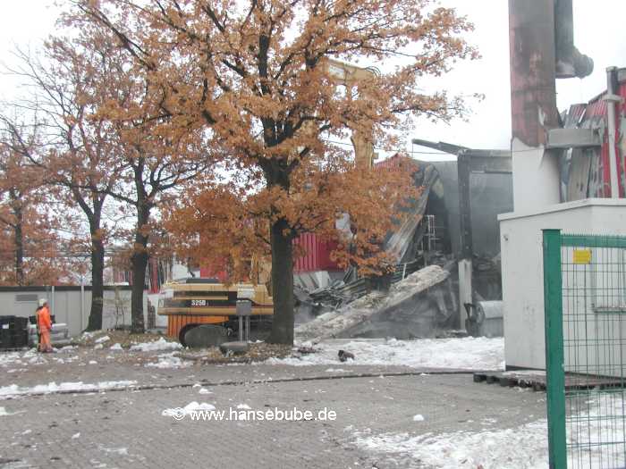 An der Brandruine wurden mehrer Baumaschinen zum auseinanderziehen des Brandschuttes eingesetzt
