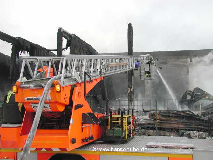 Von der Drehleiter der FF Kaltenkirchen werden Brandnester abgelöscht