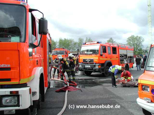 Während sich links gerade ein Angriffstrupp unter Atemschutz auf den Weg macht ,